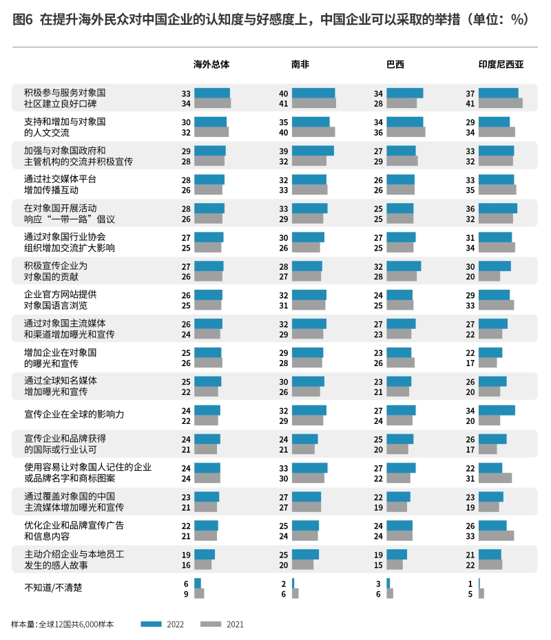 与2021年对比来看,海外受访者仍然认为积极提供社区服务(33%)、增进与本国的人文交流(30%)是中国企业提升当地民众了解度和好感度的较为有效的途径。